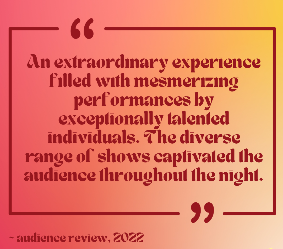 In the past, as part of our evenings, we have shown live classical music, stand up comedy, drag artists (Queens, Kings and Clowns), professional singing, sketch comedy, theatrical extracts and burlesque.
