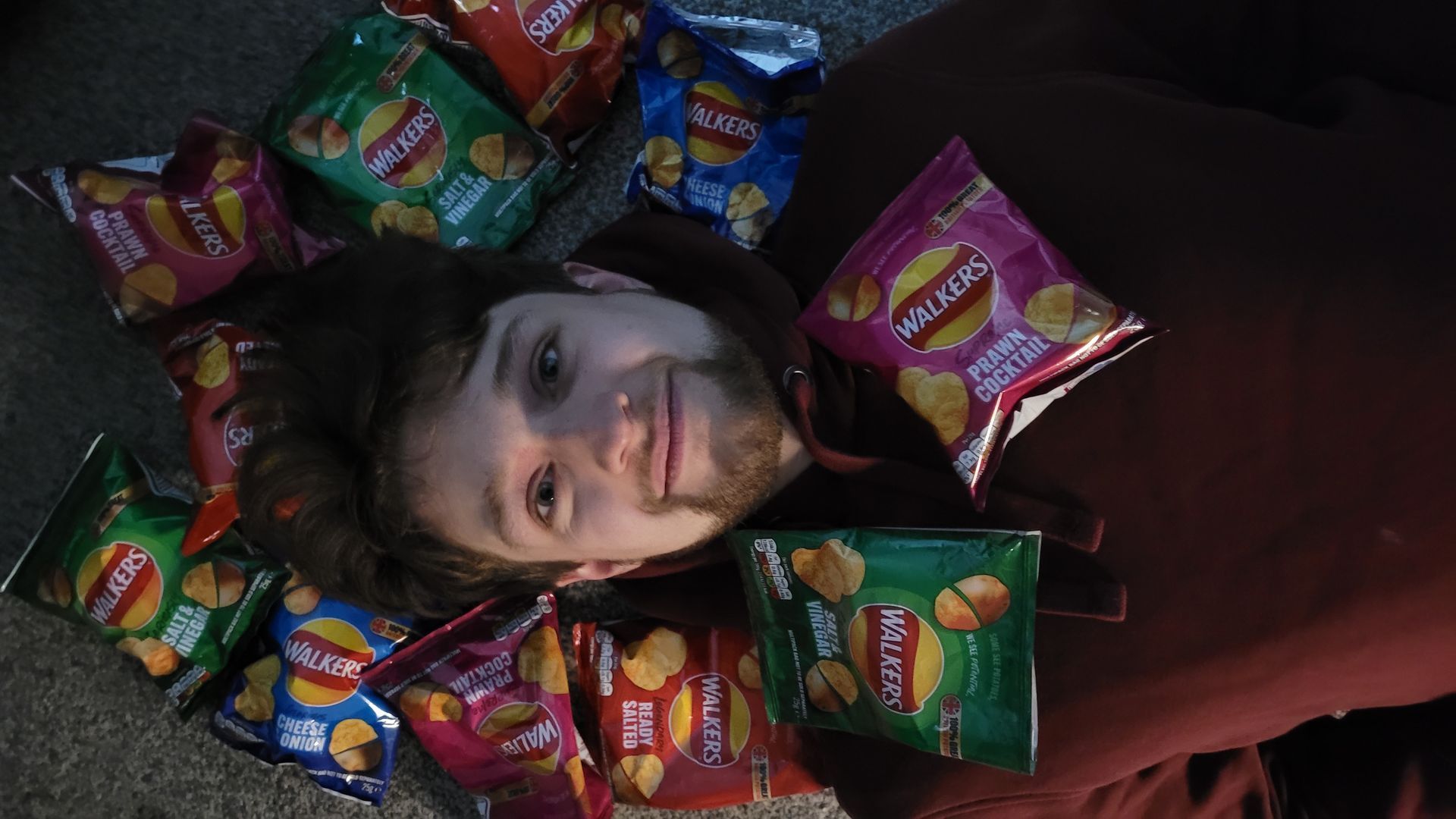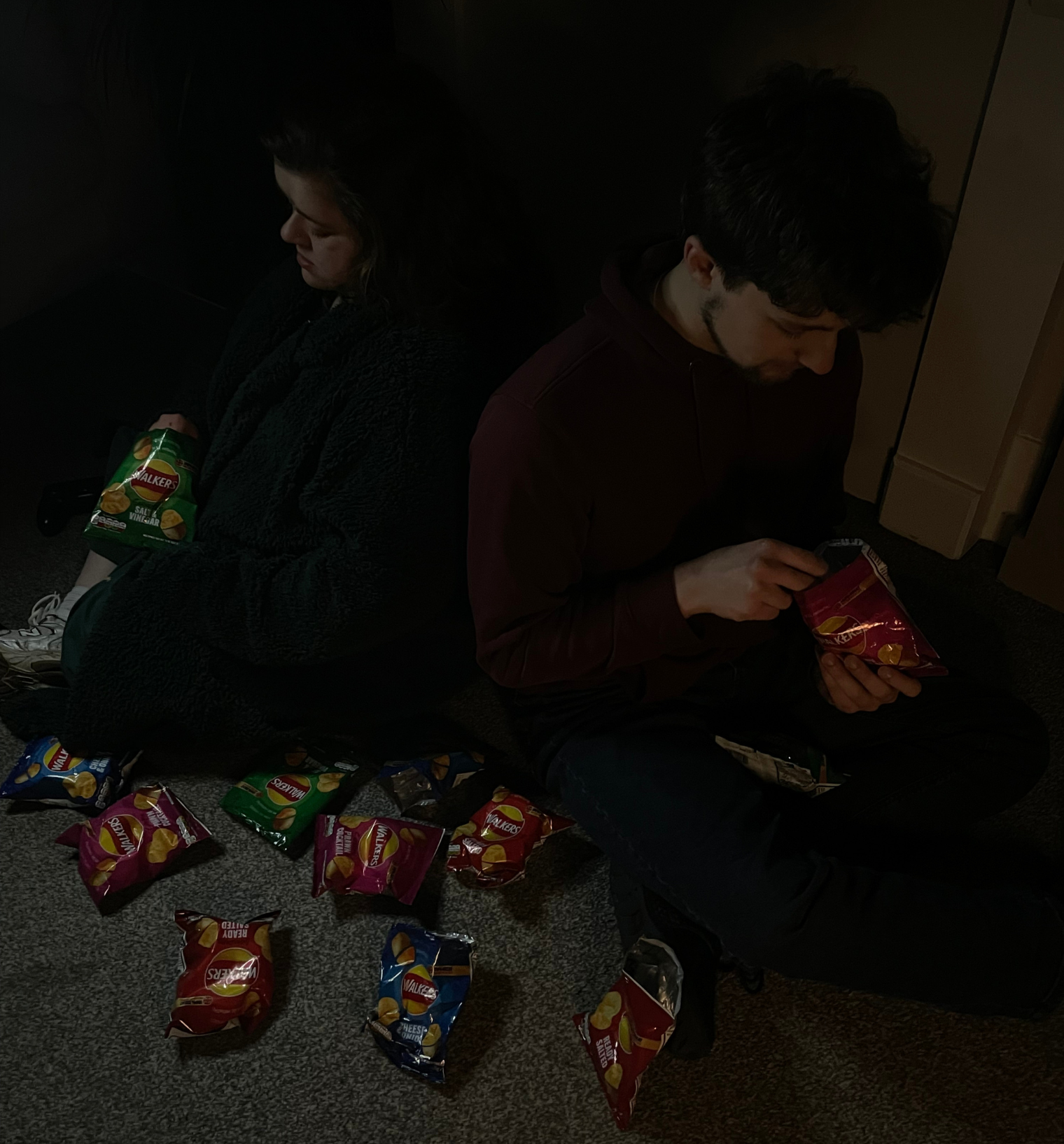 in the darkness - and Walkers Ready Salted crisps.